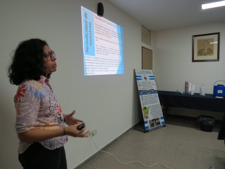 La jornada inició con la exposición de la Lic. Eugenia Moyano Wagner, del Departamento de Calidad de Agua de la Subdirección de Monitoreo y Laboratorio Ambiental, sobre las tareas de monitoreo y los protocolos utilizados para la toma de muestras de agua en los cauces hídricos de Tucumán y en la cuenca Salí-Dulce.