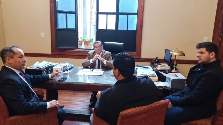 El ministro de Desarrollo Productivo, Álvaro Simón Padrós, junto al director de la Unidad Ejecutora Provincial, Julio Piedrabuena, recibieron al comisionado comunal de Los Puestos, Víctor “Petete” Cuevas, para analizar proyectos que impulsen la producción frutihortícola de la zona.