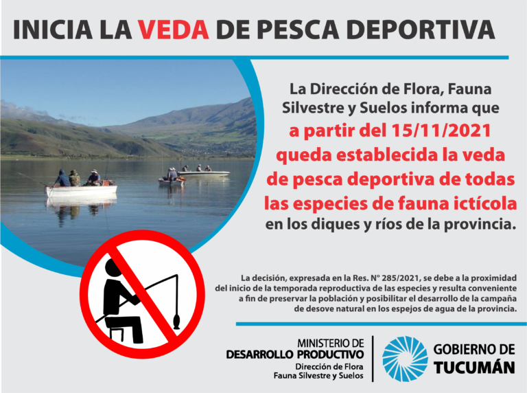 La Dirección de Flora, Fauna Silvestre y Suelos del MDP informa que, desde el día 15 de noviembre del corriente año, queda establecida la veda de pesca deportiva sobre todas las especies en los diques y/o espejos de agua y cursos de agua permanente y temporarios del ámbito provincial.