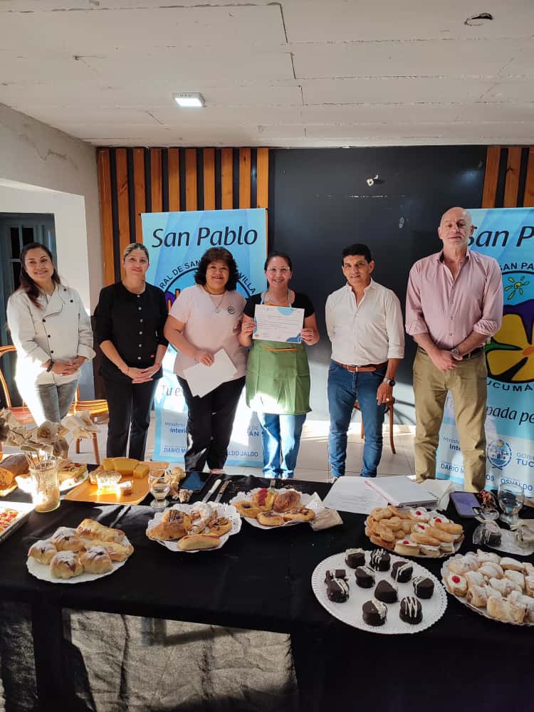 El director de Empleo, Sr. Julio Jarma, de la Secretaría de Producción, junto al comisionado comunal de San Pablo y Villa Nougués, Sr. Miguel Ángel González, hicieron entrega de certificados a los participantes del curso «Técnica y Tradición en la Elaboración de Panes y Productos Artesanales”, en el marco del programa “Tucumán Capacita”.