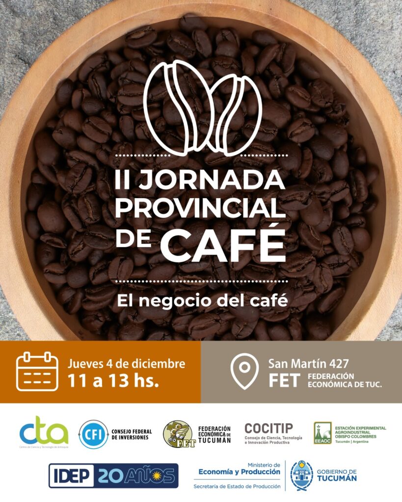 Se llevará a cabo la 2° Jornada Provincial de Café, un espacio de trabajo orientado a fortalecer la producción y el desarrollo del café de especialidad en la provincia. La actividad consistirá en una charla magistral, a cargo de especialistas colombianos, que se llevará a cabo el jueves 4 de diciembre, de 11 a 13 horas, en la sede de la Federación Económica de Tucumán (FET), ubicada en San Martín 427, San Miguel de Tucumán. La inscripción es online y gratuita.