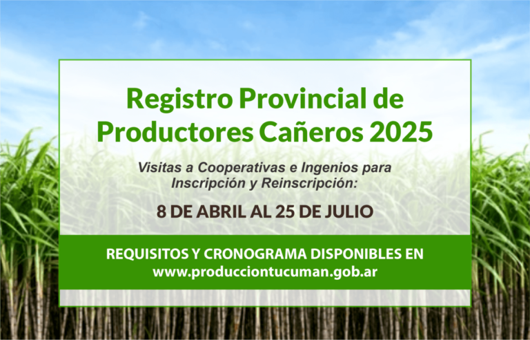 La Dirección de Agricultura de la Secretaría de Producción informa a productores que el día 8 de abril iniciará el periodo de inscripción y reinscripción al Registro Provincial de Productores Cañeros para la campaña 2025.