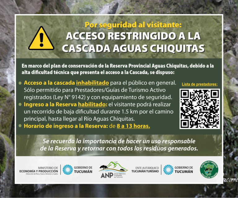 En el marco del plan de conservación de la Reserva Provincial Aguas Chiquitas, la cual forma parte del Parque Provincial El Cadillal, la Dirección de Flora, Fauna Silvestre y Suelos en conjunto con el Ente Autárquico Tucumán Turismo y la División de Delitos Rurales y Ambientales informan que, debido a la alta dificultad técnica que presenta el acceso a la Cascada de Aguas Chiquitas, se dispusieron medidas a tener en cuenta para seguridad al visitante, ante la organización de paseos en la Reserva: