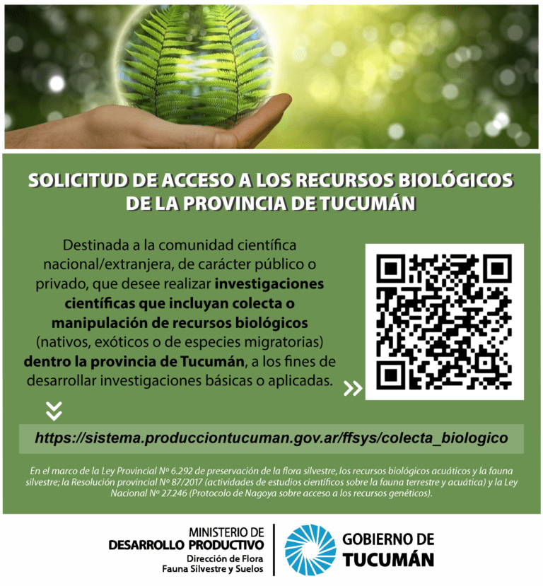 En el marco de la Ley Provincial Nº 6.292 de preservación de la flora silvestre, los recursos biológicos acuáticos y la fauna silvestre; la Resolución provincial Nº 87/2017 (actividades de estudios científicos sobre la fauna terrestre y acuática) y la Ley Nacional Nº 27.246 (Protocolo de Nagoya sobre acceso a los recursos genéticos); la toma de muestras de recursos biológicos como su posterior acceso para su utilización deben ser autorizadas por la provincia. Por ello, la Dirección de Flora, Fauna Silvestre y Suelos del MDP, en carácter de autoridad de aplicación responsable del manejo y conservación de los recursos naturales, pone a disposición el nuevo formulario online de “Solicitud de Acceso a los Recursos Biológicos de la provincia de Tucumán”.